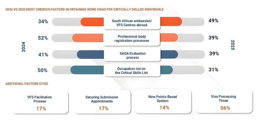 Jacobs points out that although issues at South African embassies and VFS Centres remain a challenge for companies applying for visas for critically skilled professionals, other factors cited in previous years have improved notably, as shown below.